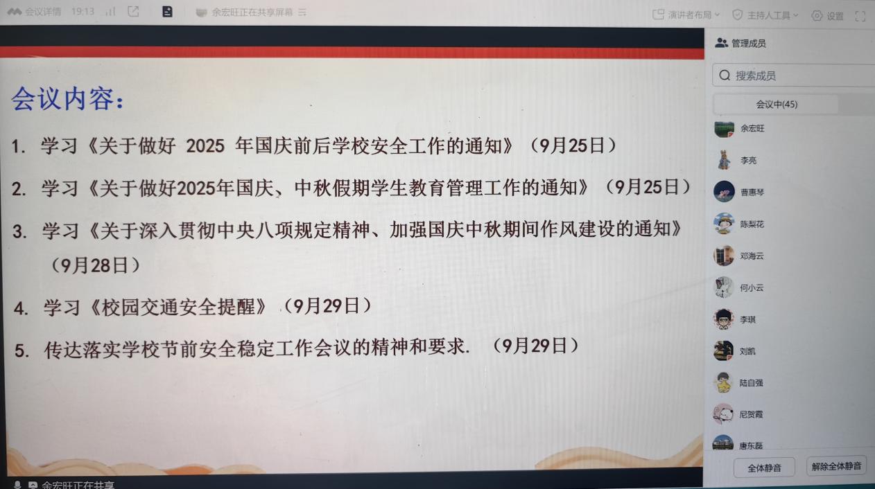 会议围绕“人人有责、人人负责、人人尽责”的安全理念,集中学习了《关于做好 2025 年国庆前后学校安全工作的通知》和《校园交通安全提醒》等文件,系统传达了学校节前安全稳定工作会议的精神和内容,并结合当前形势,对消防安全、交通出行、意识形态、防诈反诈等重点领域作出细致部署,进一步明确了安全注意事项与相关纪律要求。