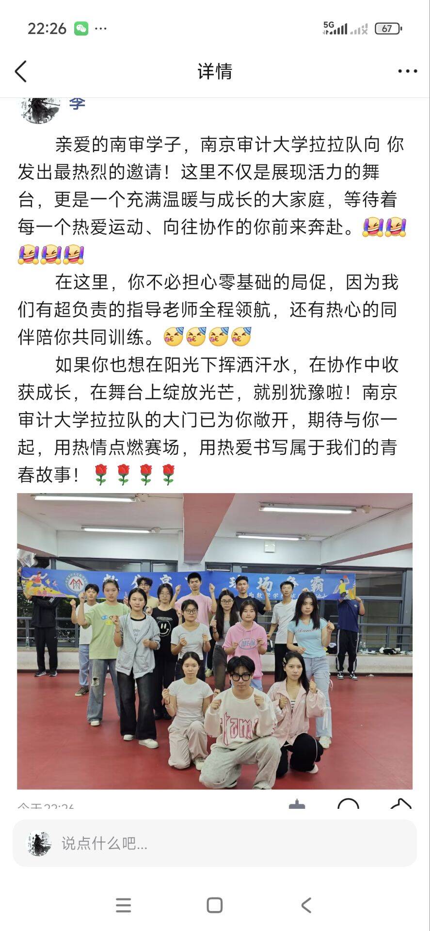 此外,数学学院啦啦队的队员们也通过朋友圈等平台,用充满巧思的方式分享训练日常。这些充满温度的分享,生动记录着备赛历程中的点滴成长,吸引了众多师生关注联赛动态,为全院及全校运动员加油鼓劲。当青春的旋律随节拍起舞,当梦想在旋转跳跃中绽放光彩,她们正用身体语言证明:这不仅仅是一支啦啦队,更是青春活力的生动写照,是团结与热情交织的动人篇章,是校园生活中最亮丽的那一道风景线。