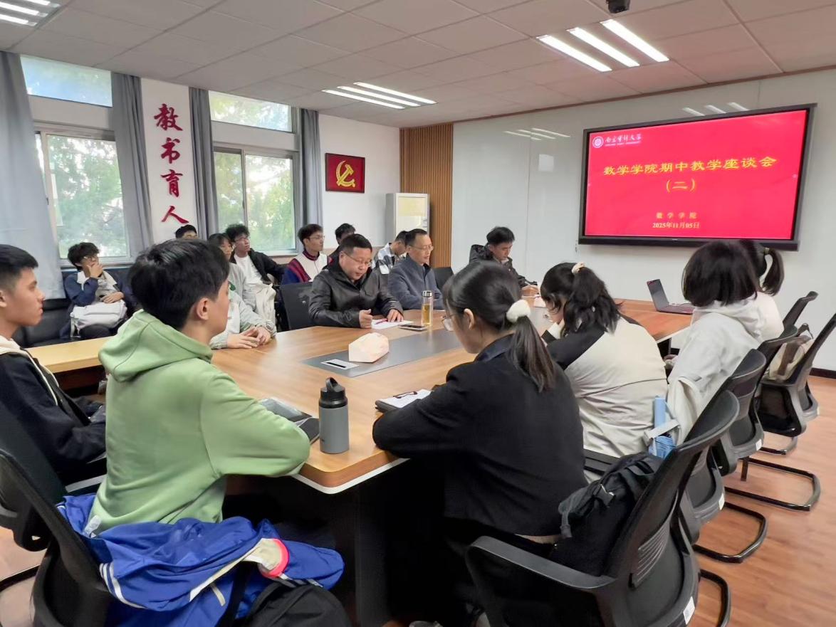 为进一步了解数学公共课程教学运行情况,持续提升教学质量,增进师生交流,数学学院于近期分别组织召开了概率论与数理统计、微积分两门核心公共课程的期中教学座谈会。学院教学副院长唐东磊、教务办公室主任杨忍军及教师代表参加会议,认真听取了来自不同院系、不同班级的学生代表们的意见和建议。