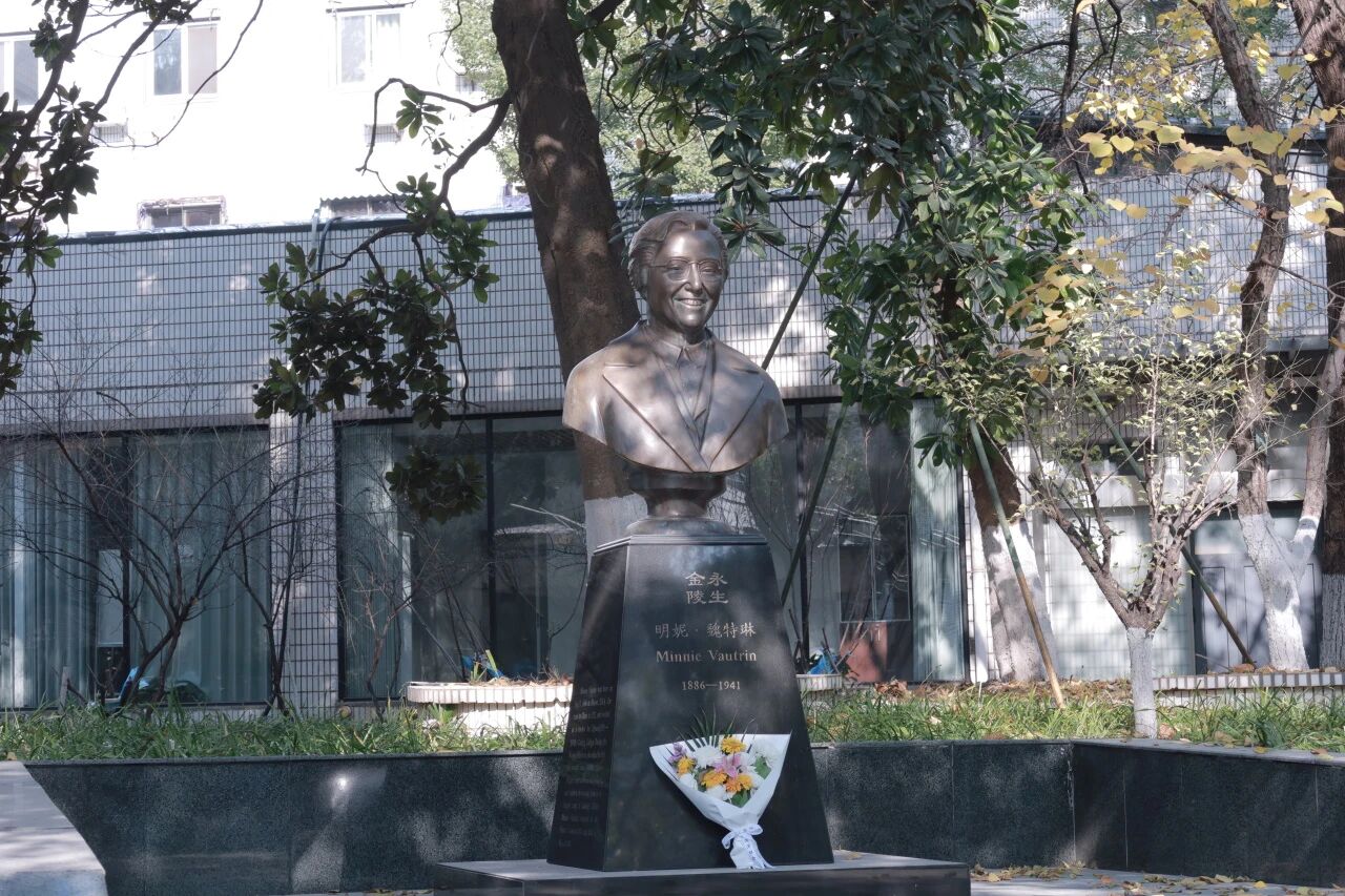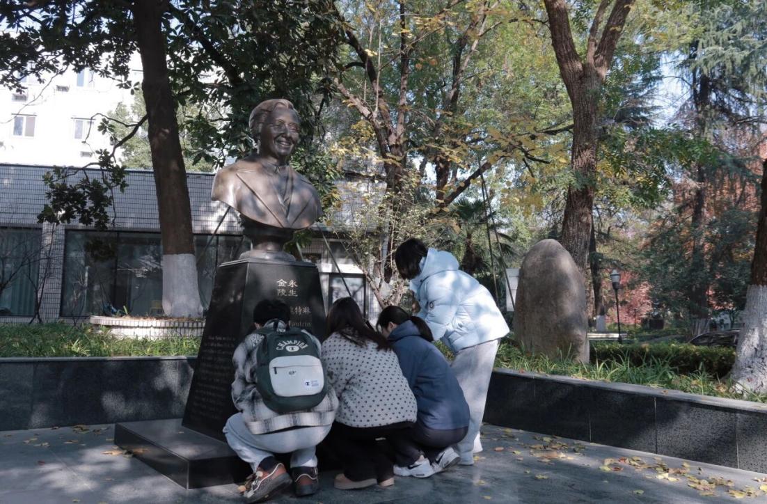 接着,两校师生共同来到明妮·魏特琳雕像前,举行庄重的献花仪式。洁白的鲜花寄托着对这位“南京大屠杀中的英雄”的深切缅怀与崇高敬意。面对雕像,大家神情肃穆,鞠躬致敬,重温那段不能忘却的历史,更坚定了铭记历史、珍爱和平、勇担使命的信念。