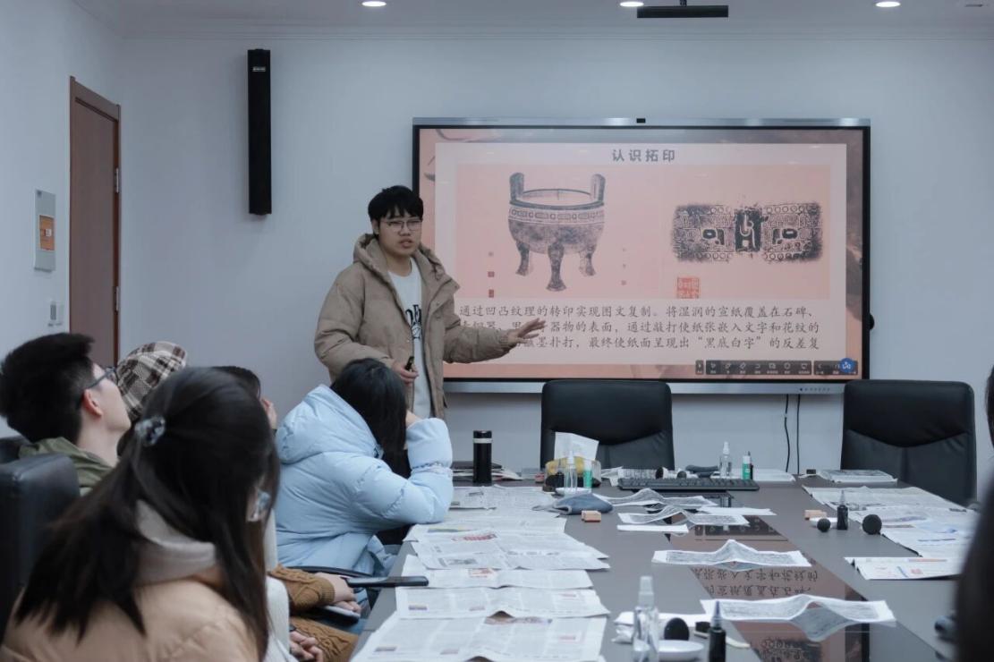 献花仪式结束后,我院师生还在南京师范大学历史文博学院进行非遗拓印实践体验活动。在历史文博学院中华优秀传统文化宣讲团成员的悉心指导下,大家亲手执帚、蘸墨、铺纸、按压,一步步将古朴的纹样清晰拓印在宣纸上。大家相互交流技巧,分享实践感悟,在动手体验中加深了对非遗文化的理解与认同。