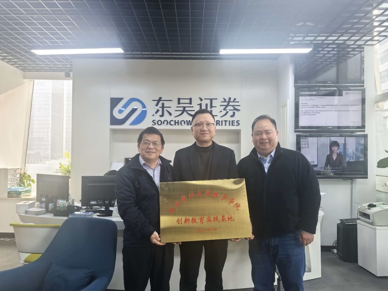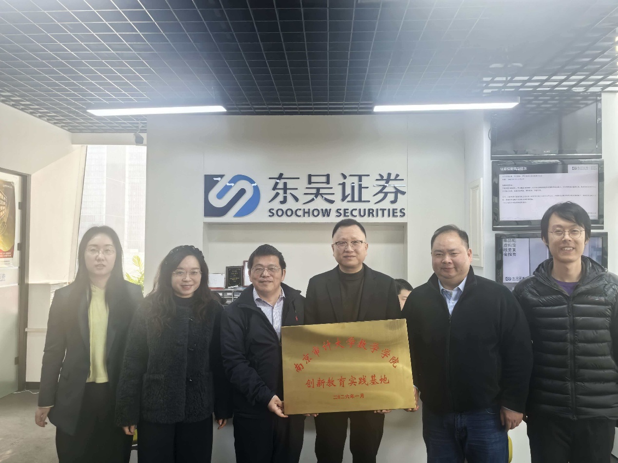 2026年1月27日,数学学院党委副书记余宏旺率队,金融数学系主任苏小囡、应用数学系主任薛帅帅一行,赴东吴证券南京国睿大厦营业部开展调研交流,并共同举行“创新教育实践基地”授牌仪式。此次活动是学院深化访企拓岗、推进巡察整改与党建引领业务融合的重要举措,旨在构建校企协同育人新平台,以实践基地为载体,推动数学学科与现代金融行业深度融合,培育契合新时代发展需要的创新型、应用型复合人才。