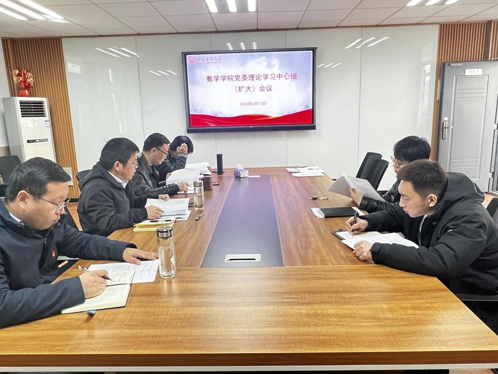 3月13日下午,数学学院在位育楼217会议室举行2026年第二期党委理论学习中心组(扩大)集体学习会。学院党委委员、党支部书记及党政办公室相关人员参加学习,会议由数学学院党委副书记余宏旺主持。