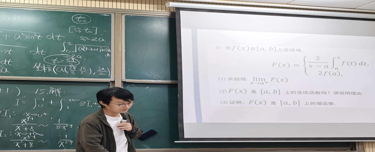 为帮助同学们夯实数学分析基础,攻克定积分与反常积分重难点,数学学院于4月8日在竞秀北楼104教室开展“导师面对面”学科辅导活动。本次活动特邀数学学院薛帅帅老师亲临现场,与同学们面对面拆解核心考点、梳理解题思路、点拨学习方法,为同学们的数学学习之路精准护航。